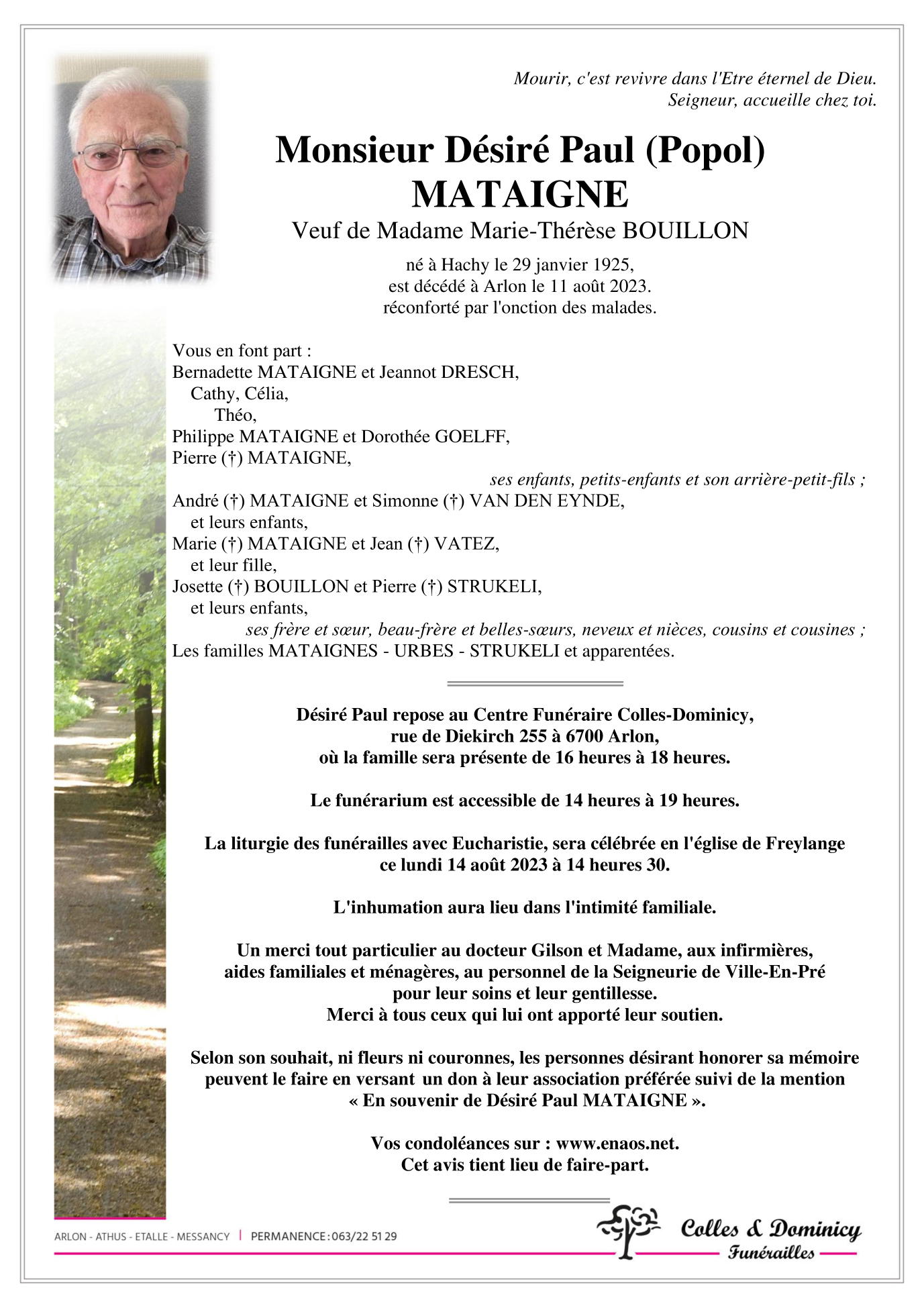 Décédé à Arlon (6700) le vendredi 11 août 2023 à l'âge de 98 ans