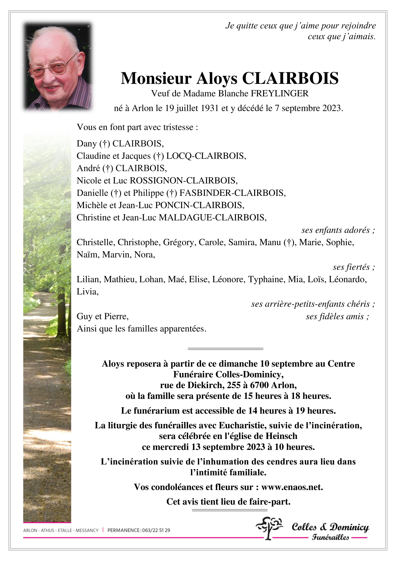 Décédé à Arlon (6700) le jeudi 7 septembre 2023 à l'âge de 92 ans