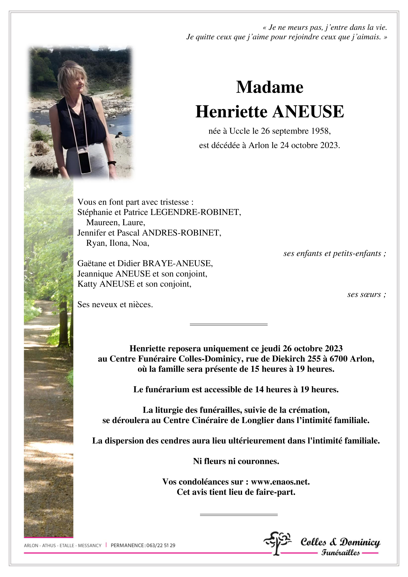 Décédée à Arlon (6700) le mardi 24 octobre 2023 à l'âge de 65 ans