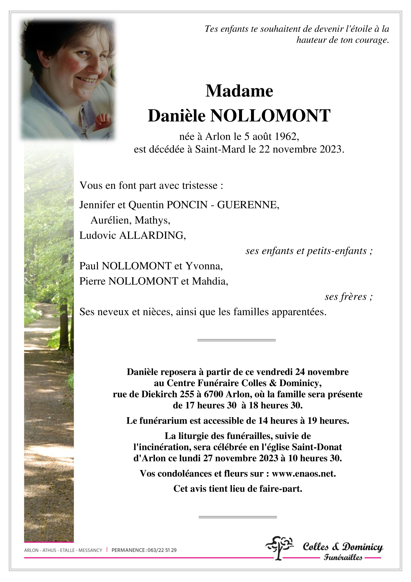 Décédée à Saint-Mard (6762) le mercredi 22 novembre 2023 à l'âge de 61 ans