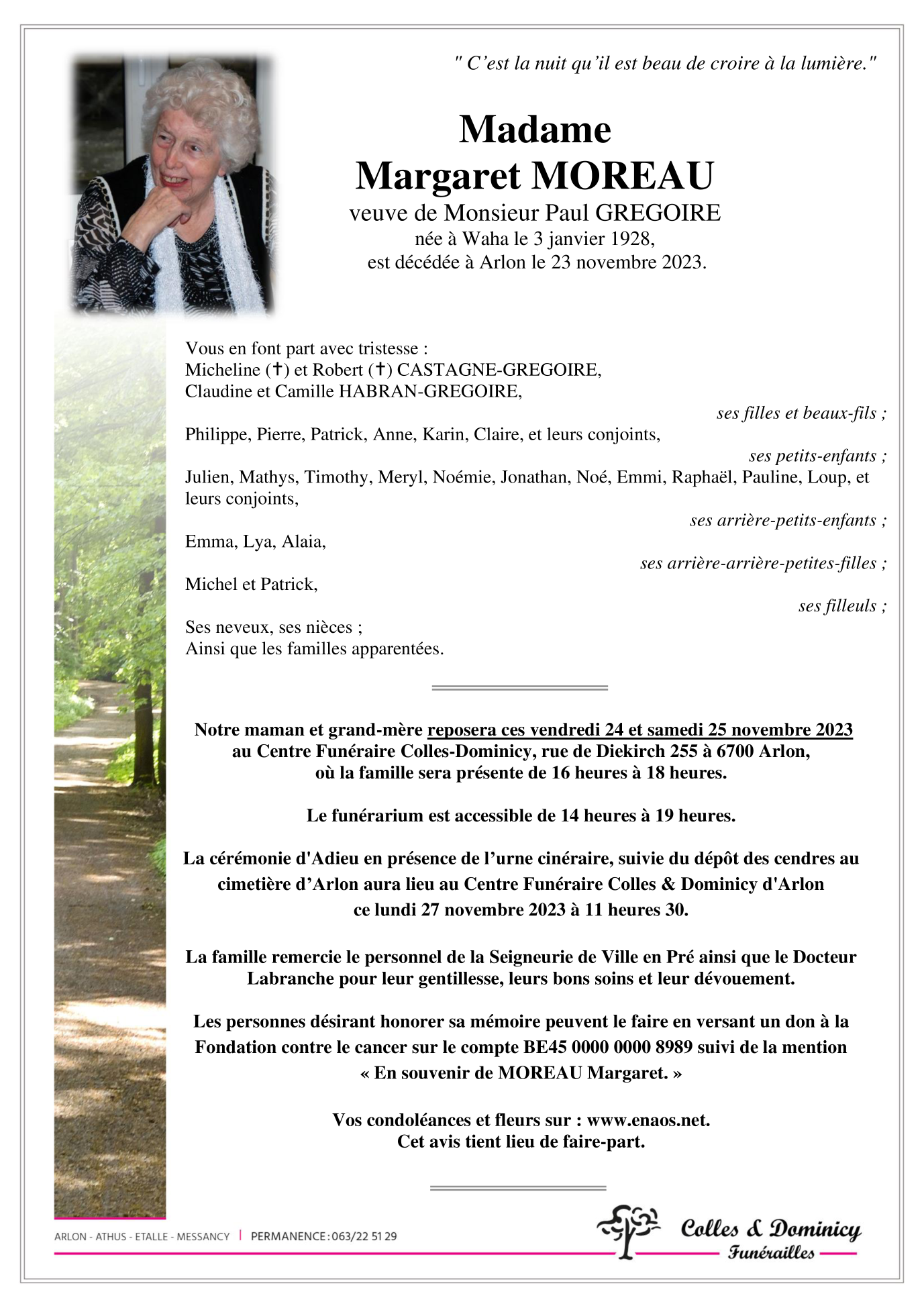 Décédée à Arlon (6700) le jeudi 23 novembre 2023 à l'âge de 95 ans
