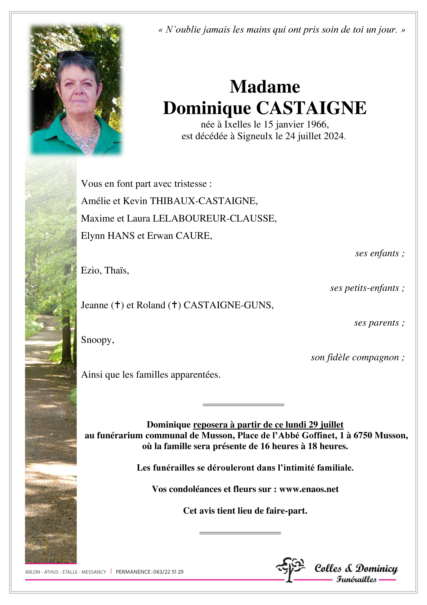 Décédée à Signeulx (6750) le mercredi 24 juillet 2024 à l'âge de 58 ans