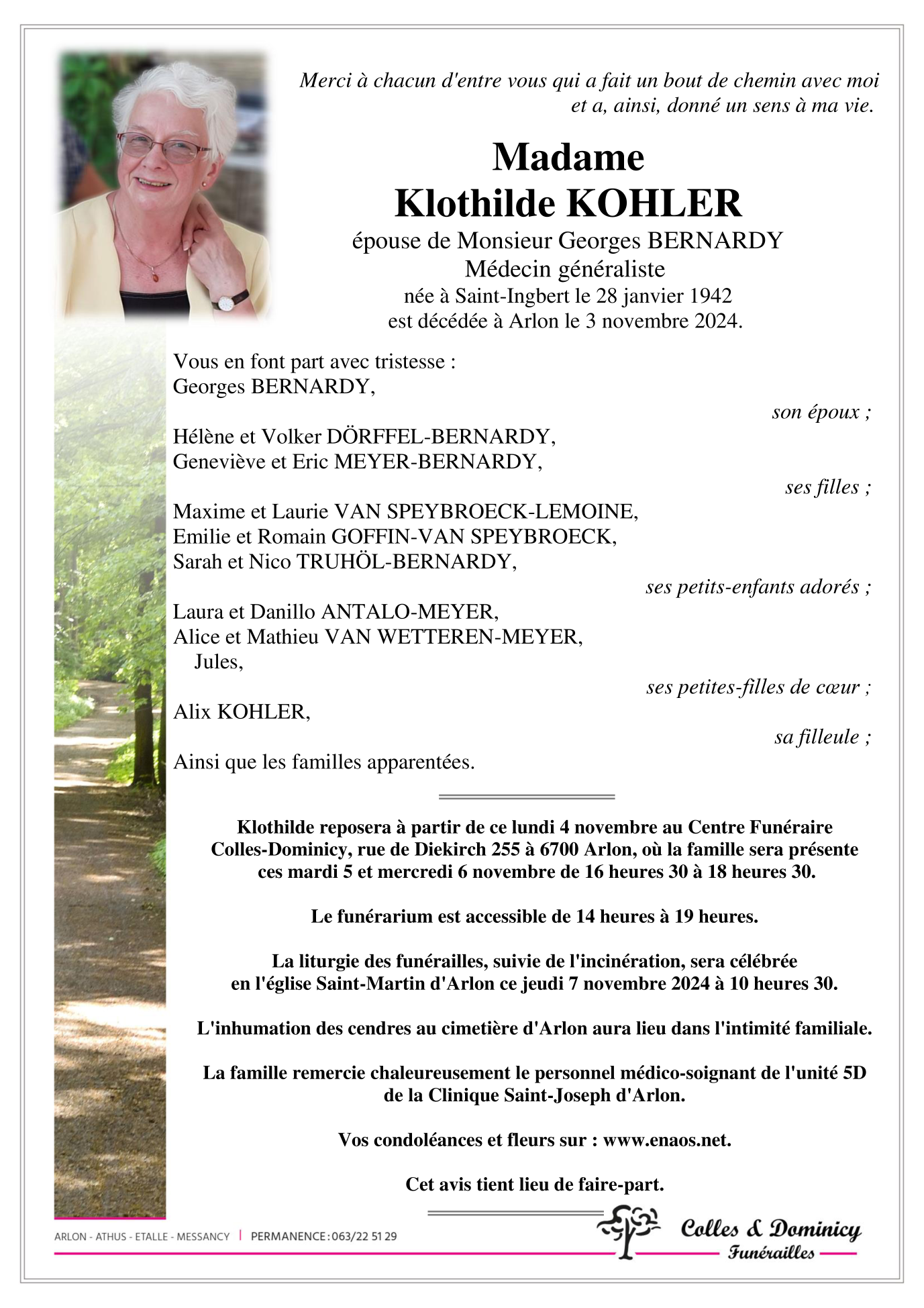 Décédée à Arlon (6700) le dimanche 3 novembre 2024 à l'âge de 82 ans