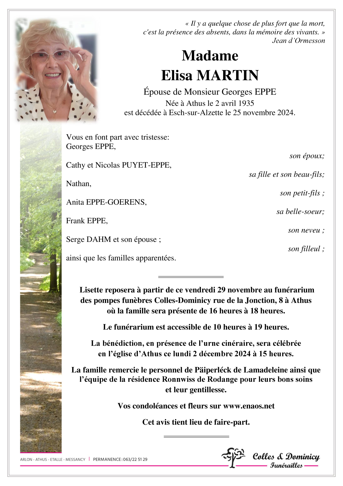 Décédée à Esch-Sur-Alzette/Mayrisch  (4240, Luxembourg) le lundi 25 novembre 2024 à l'âge de 89 ans