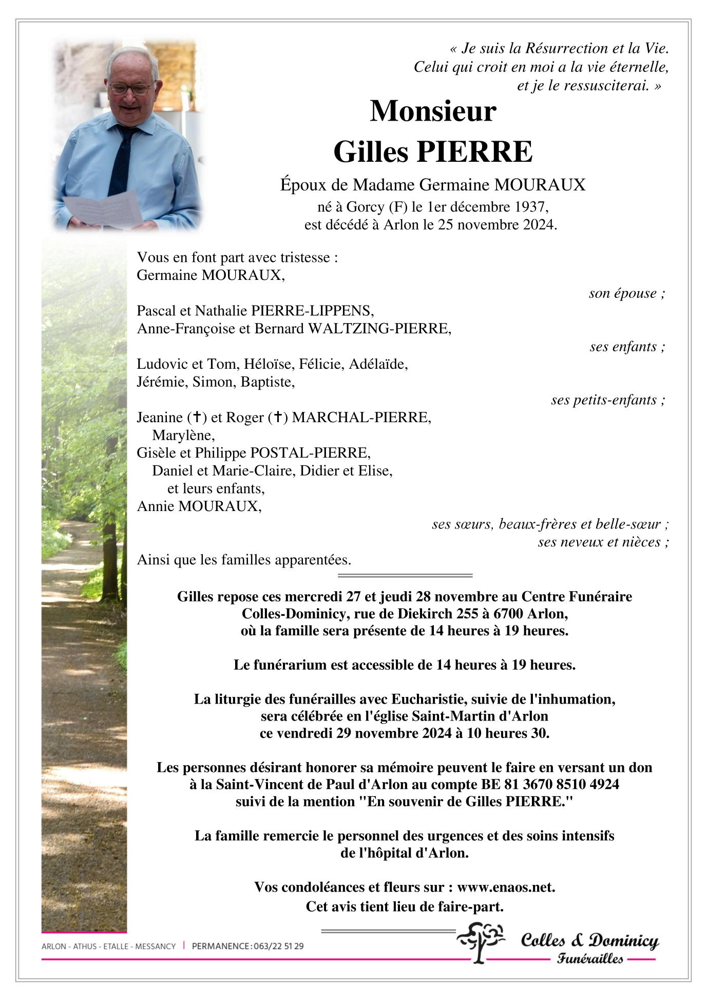 Décédé à Arlon (6700) le lundi 25 novembre 2024 à l'âge de 86 ans
