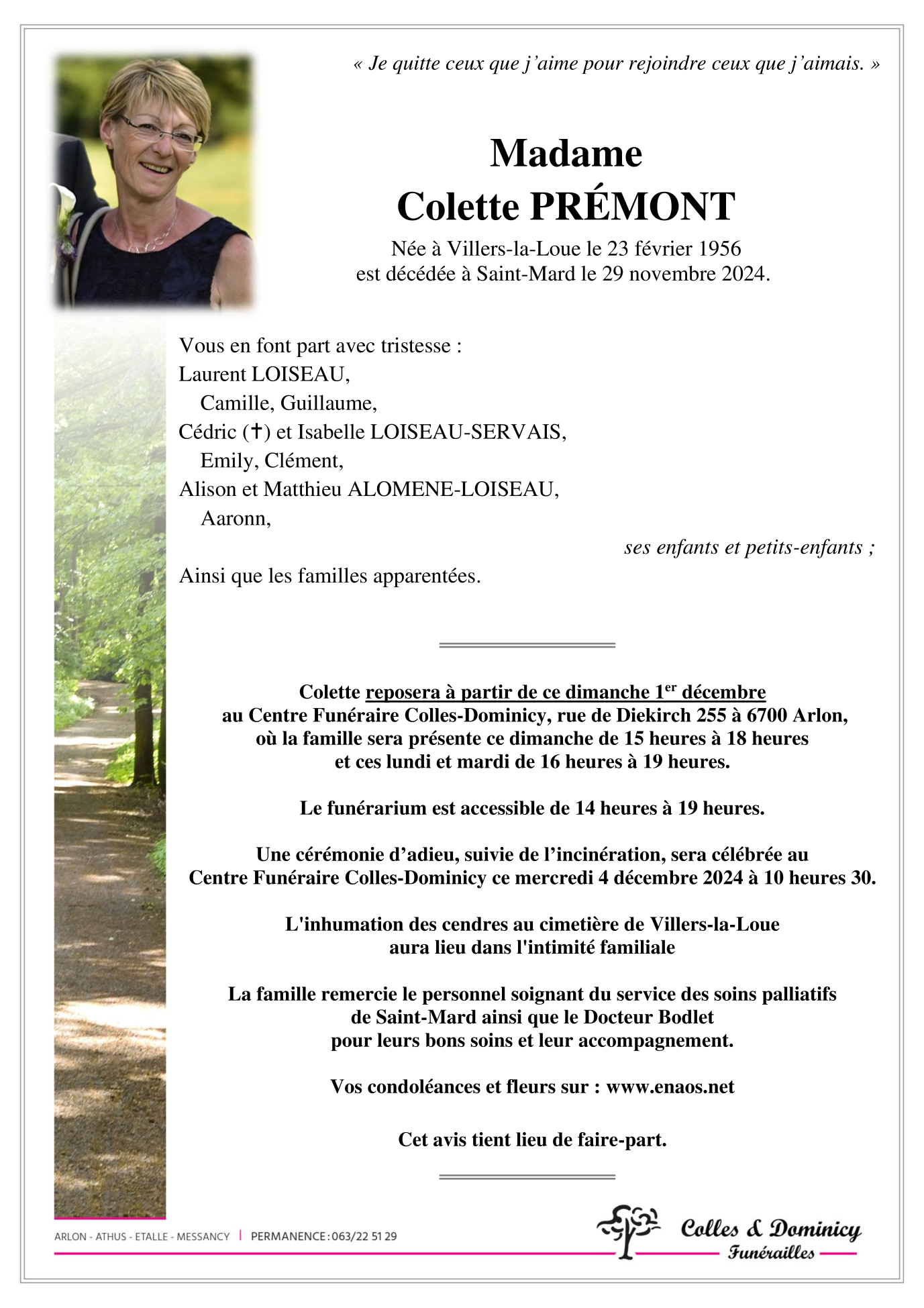 Décédée à Saint-Mard (6762) le vendredi 29 novembre 2024 à l'âge de 68 ans