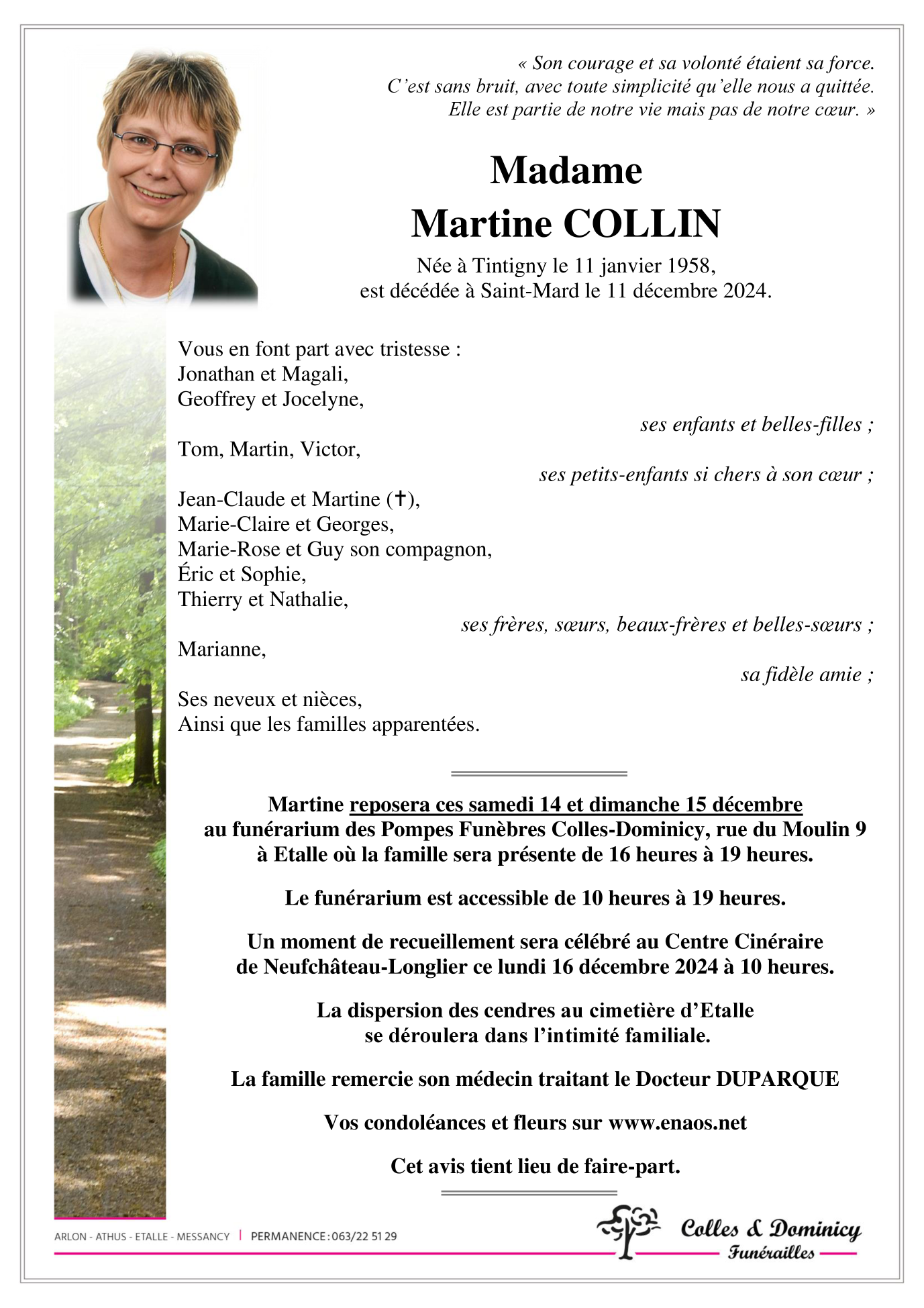Décédée à Saint-Mard (6762) le mercredi 11 décembre 2024 à l'âge de 66 ans