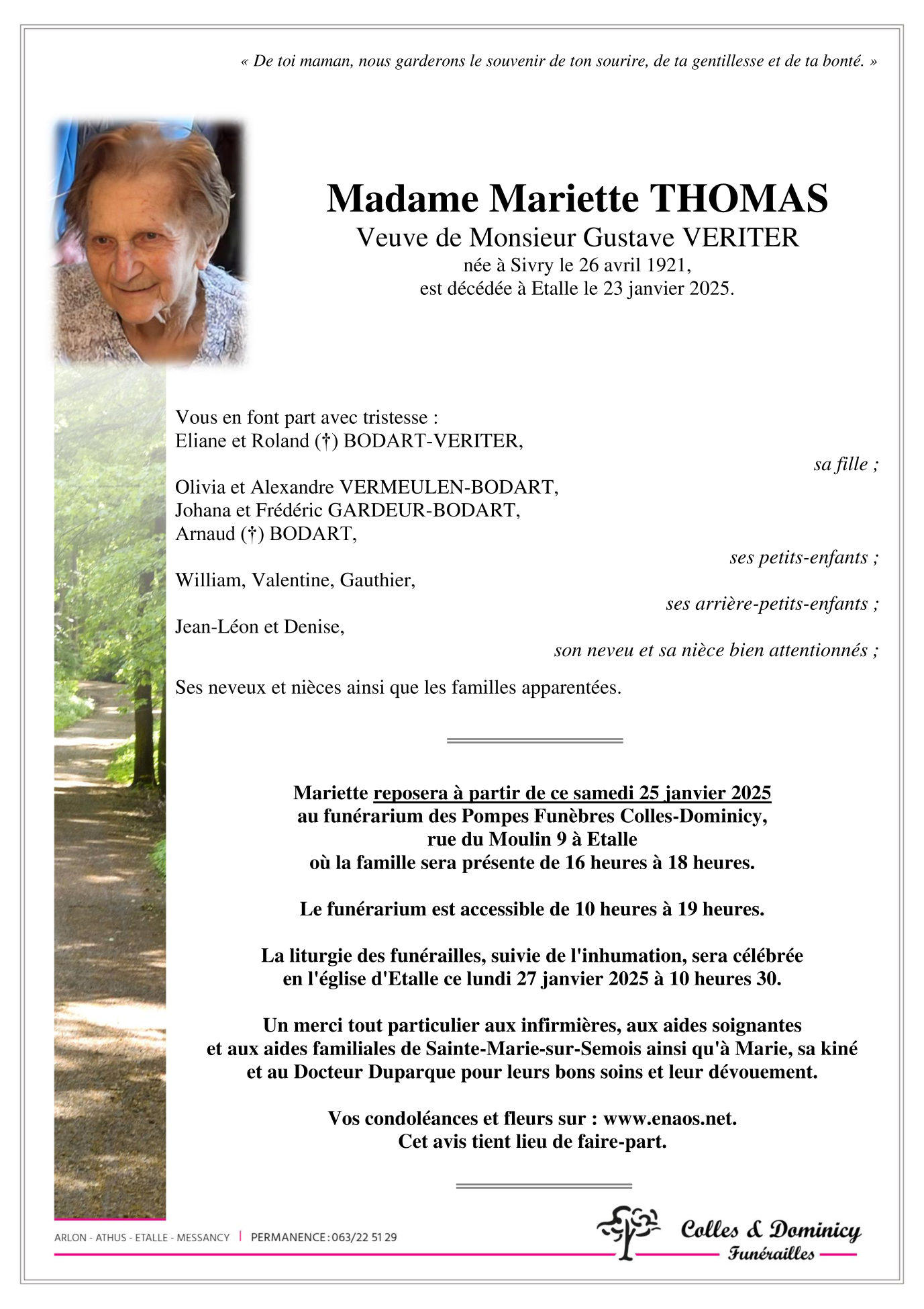 Décédée à Etalle (6740) le jeudi 23 janvier 2025 à l'âge de 103 ans