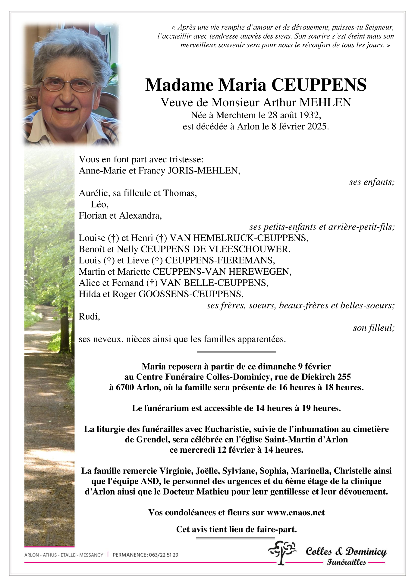 Décédée à Arlon (6700) le samedi 8 février 2025 à l'âge de 92 ans