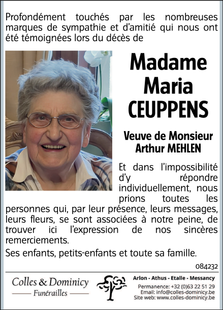 Décédée à Arlon (6700) le samedi 8 février 2025 à l'âge de 92 ans