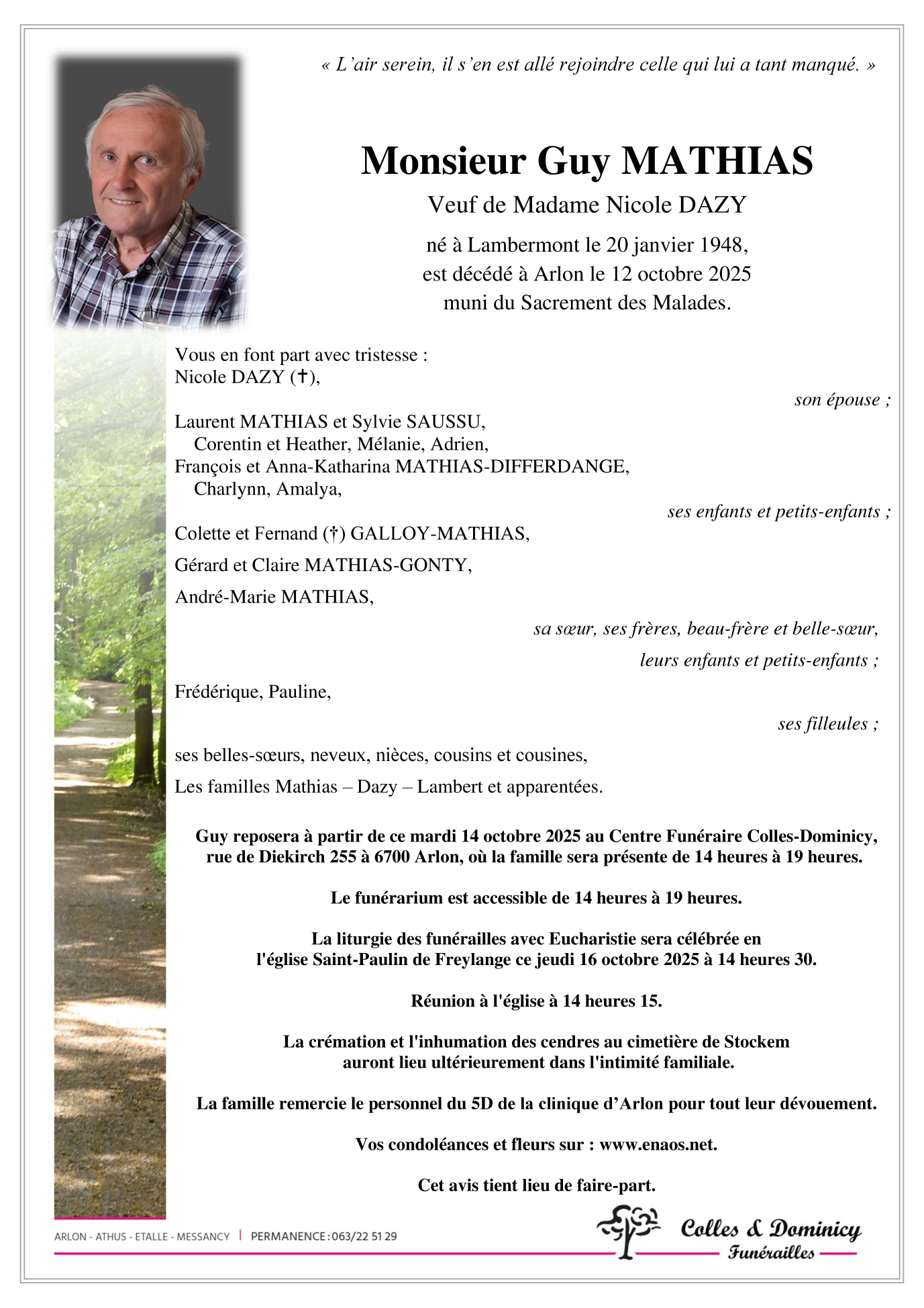 Décédé à Arlon (6700) le dimanche 12 octobre 2025 à l'âge de 77 ans