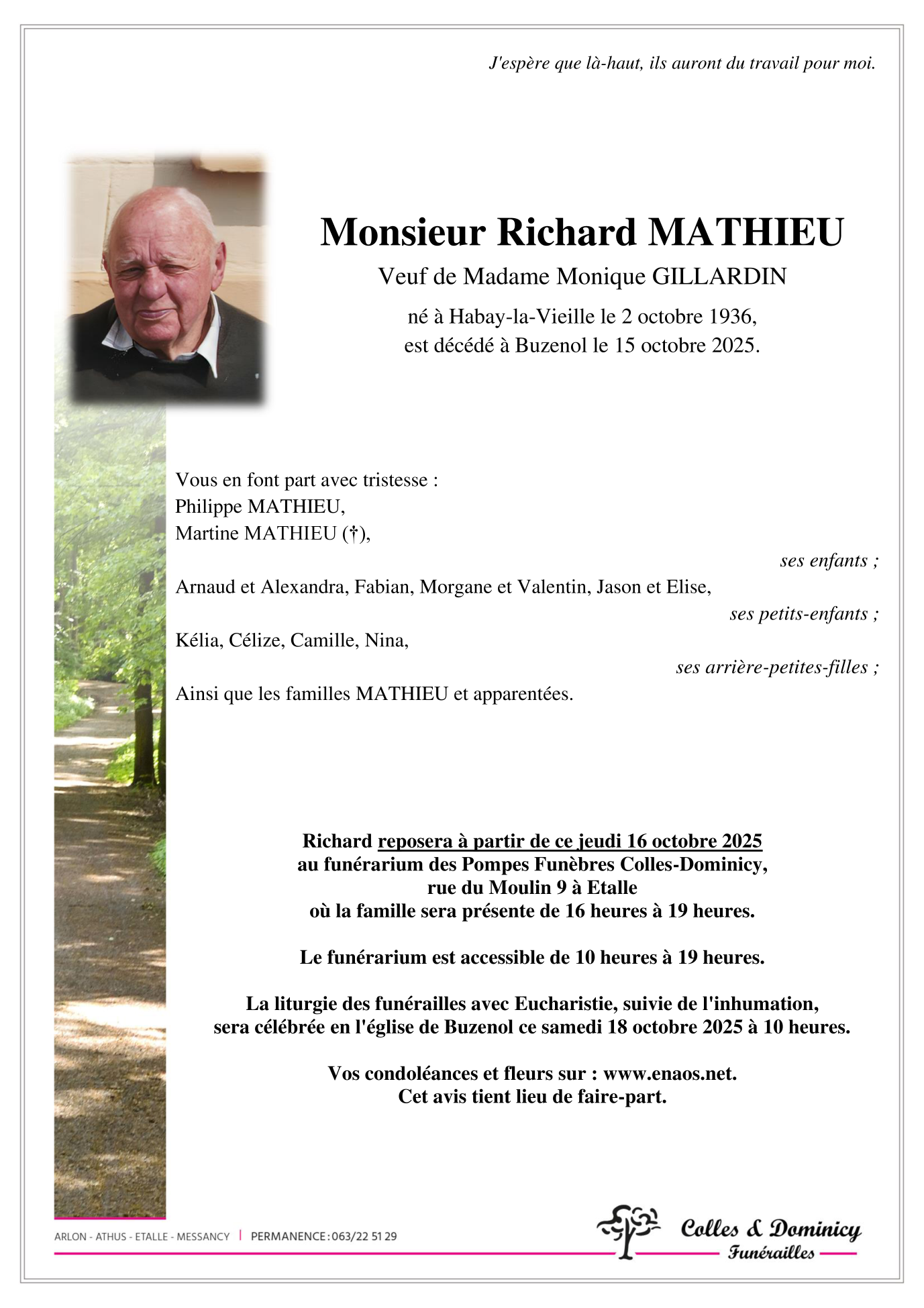 Décédé à Buzenol (6743) le mercredi 15 octobre 2025 à l'âge de 89 ans
