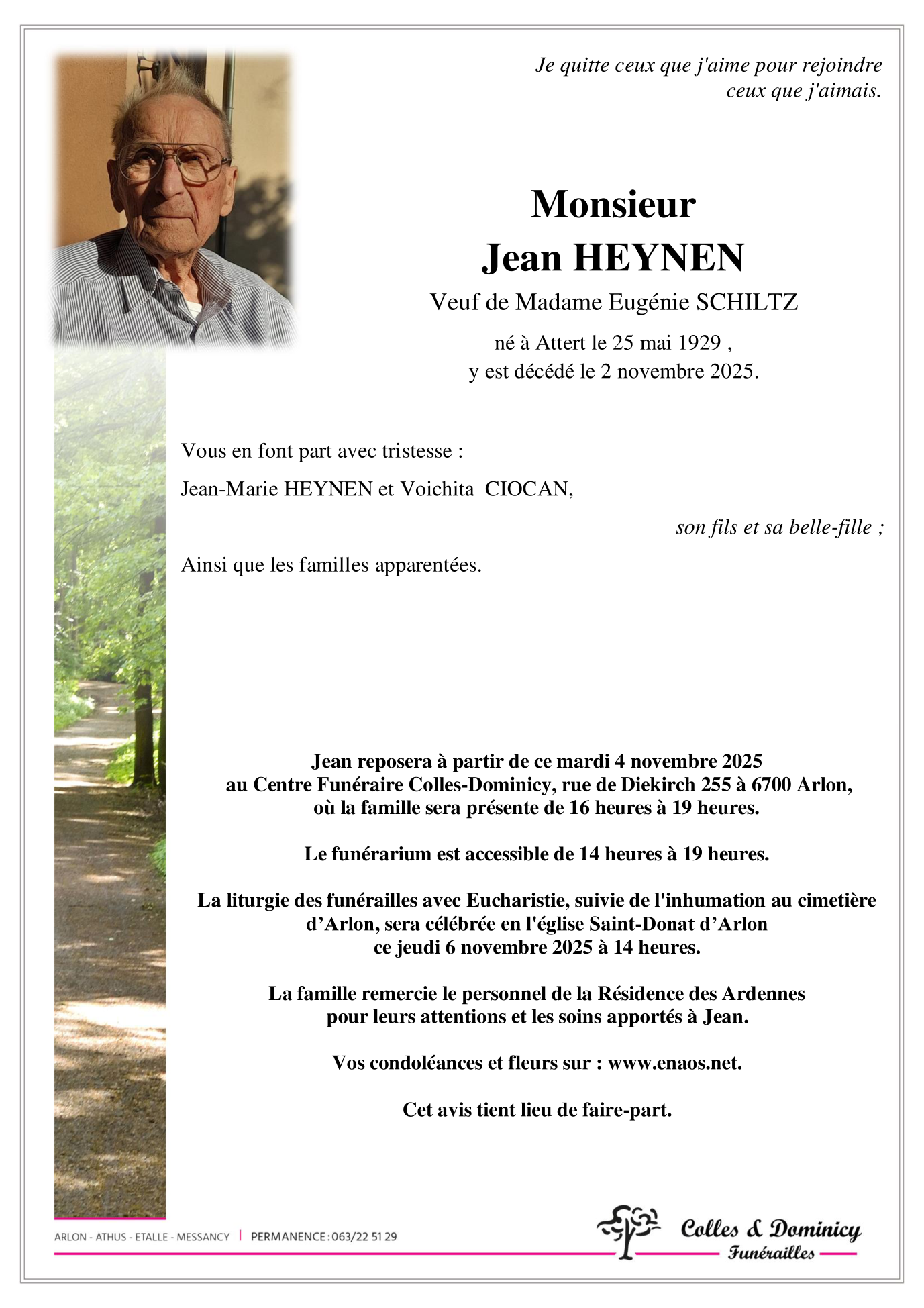 Décédé à Attert (6717) le dimanche 2 novembre 2025 à l'âge de 96 ans