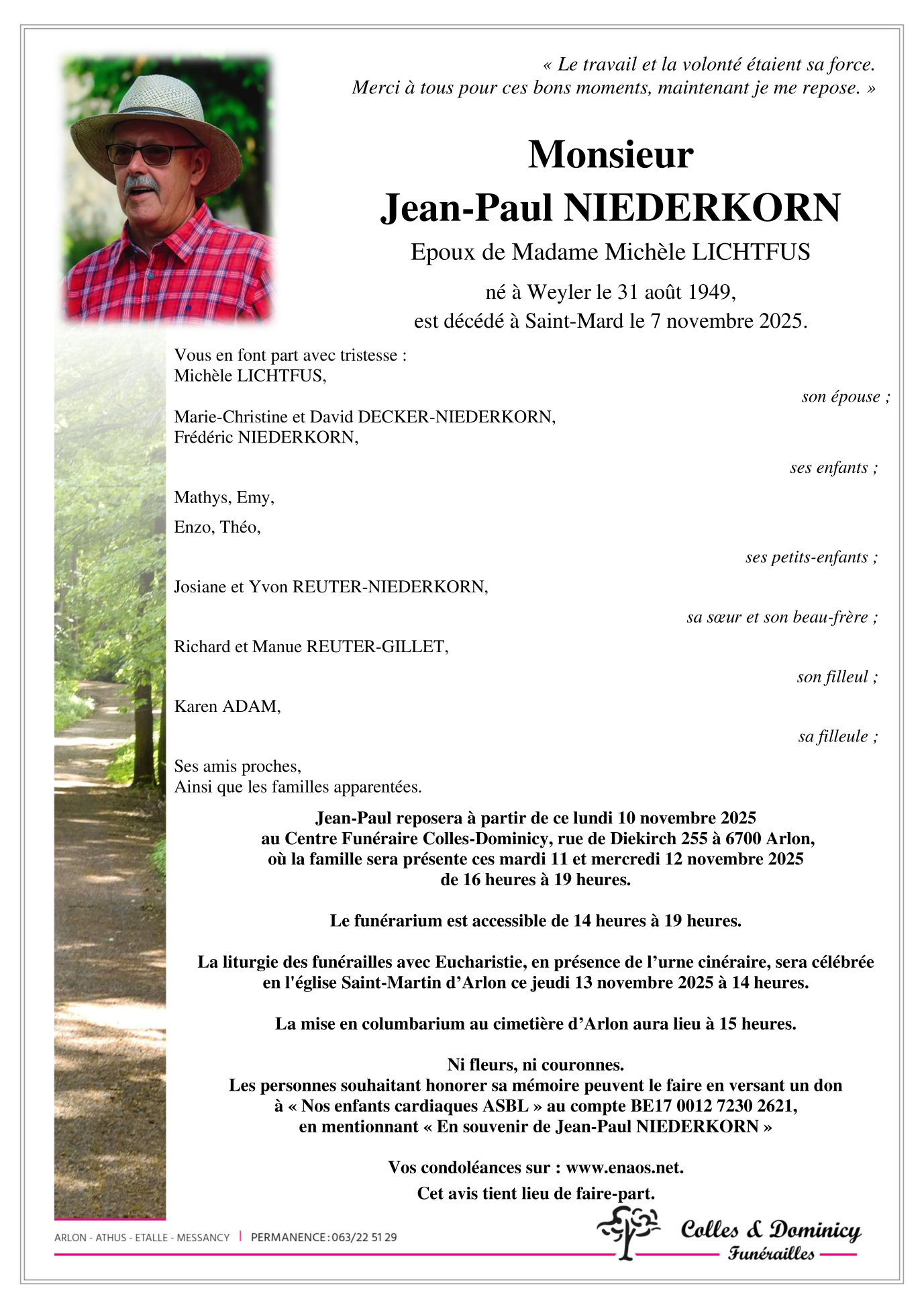 Décédé à Saint-Mard (6762) le vendredi 7 novembre 2025 à l'âge de 76 ans