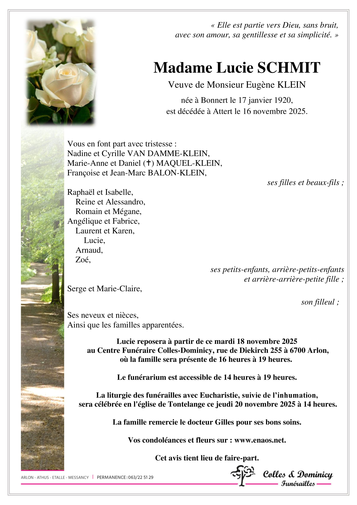 Décédée à Attert (6717) le dimanche 16 novembre 2025 à l'âge de 105 ans