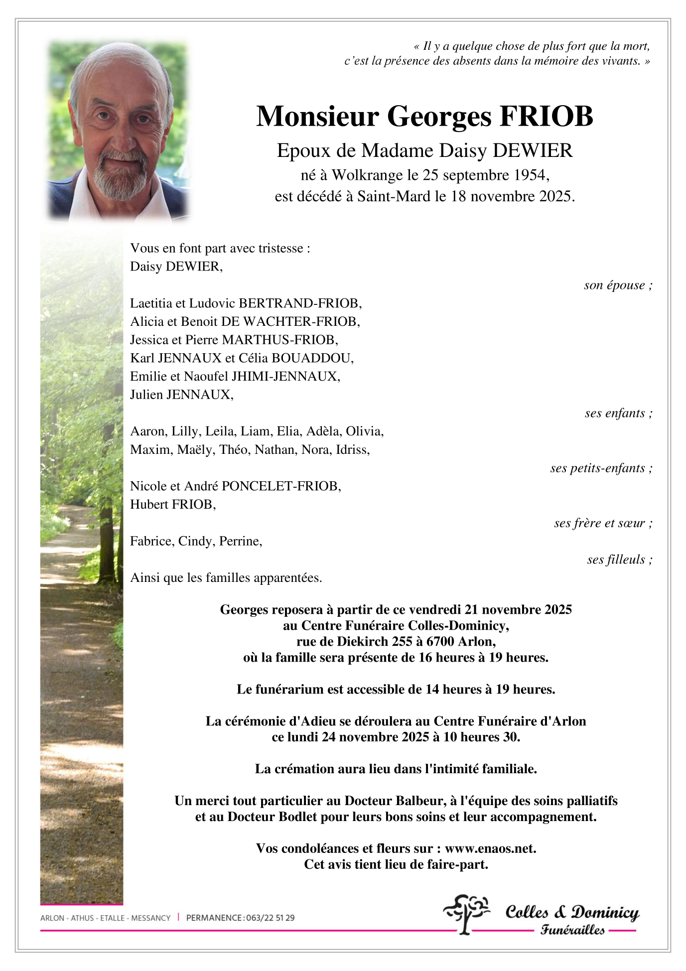 Décédé à Saint-Mard (6762) le mardi 18 novembre 2025 à l'âge de 71 ans