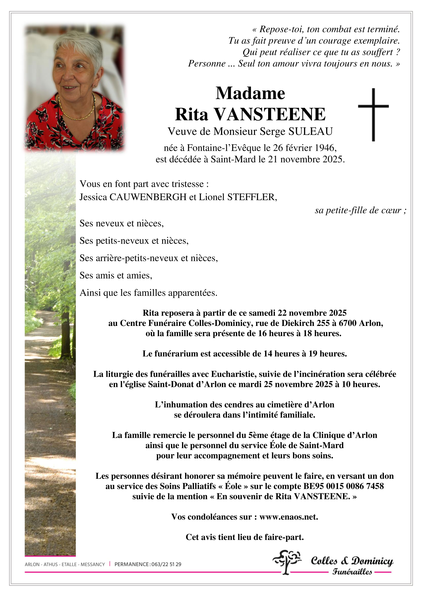 Décédée à Saint-Mard (6762) le vendredi 21 novembre 2025 à l'âge de 79 ans