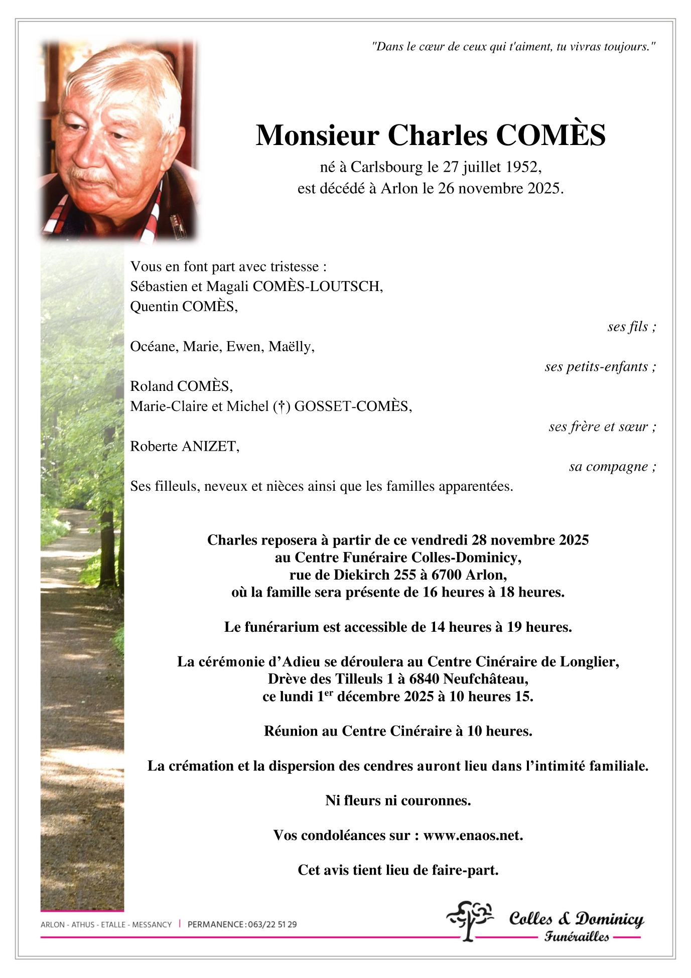 Décédé à Arlon (6700) le mercredi 26 novembre 2025 à l'âge de 73 ans