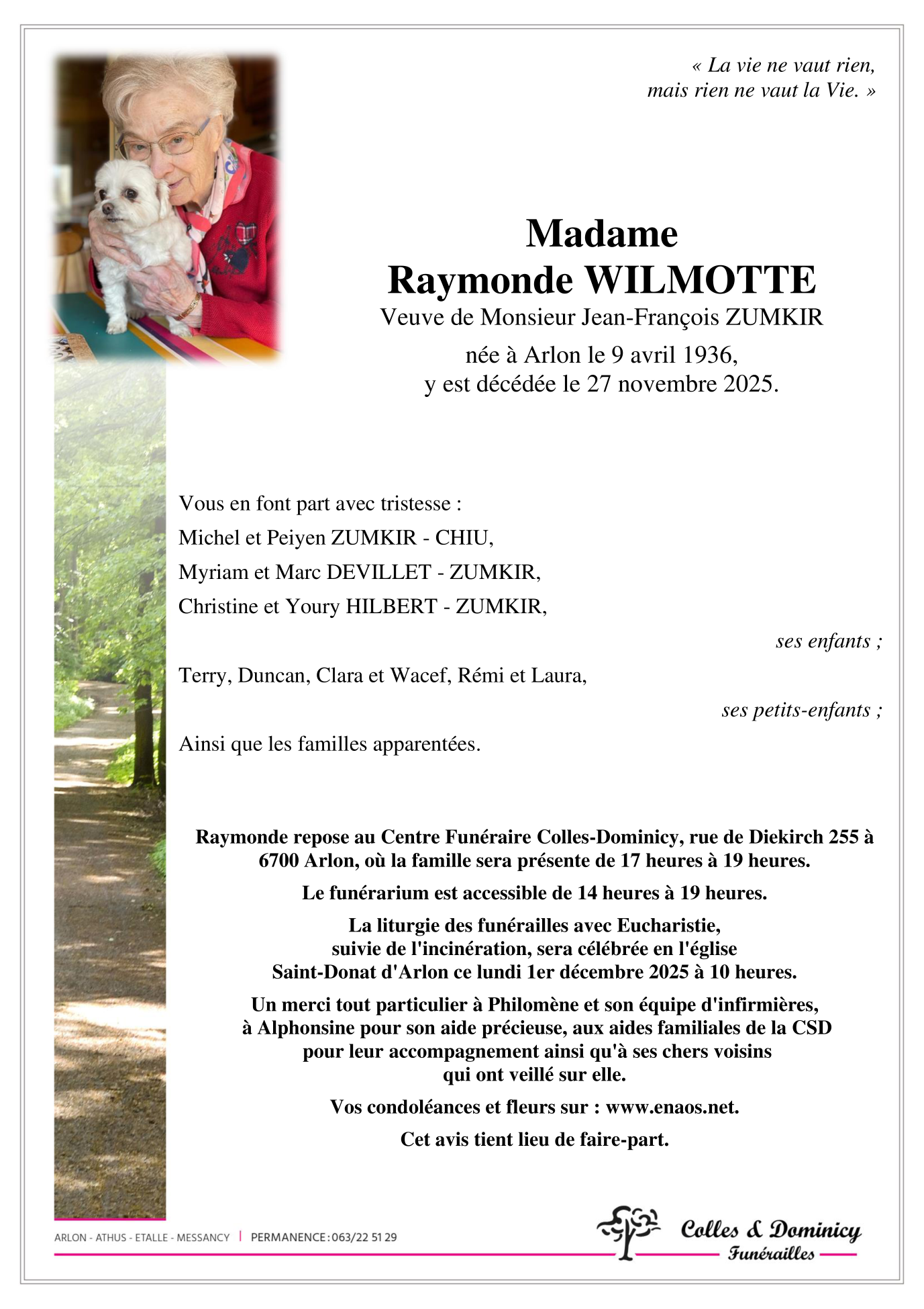 Décédée à Arlon (6700) le jeudi 27 novembre 2025 à l'âge de 89 ans