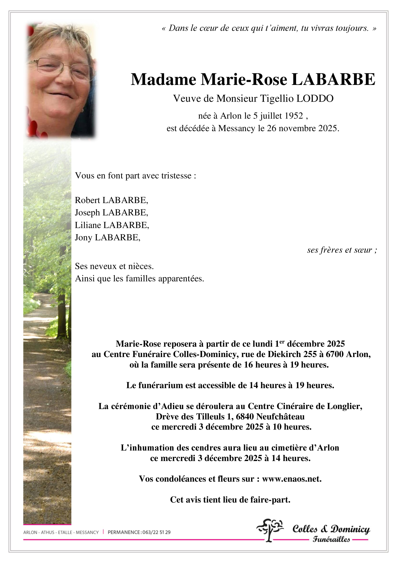 Décédée à Messancy (6780) le mercredi 26 novembre 2025 à l'âge de 73 ans