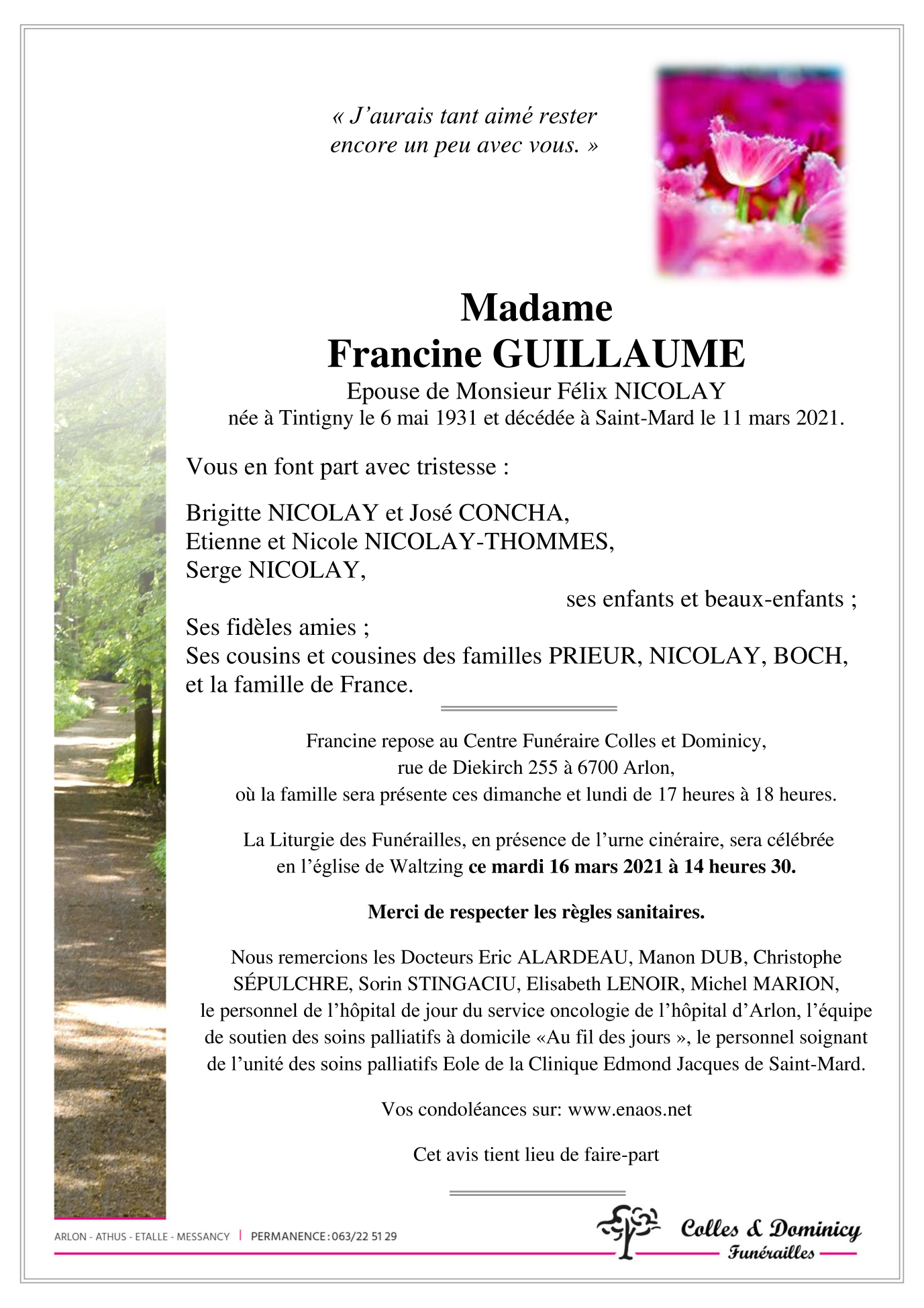 Décédée à Saint-Mard (6762) le jeudi 11 mars 2021 à l'âge de 89 ans