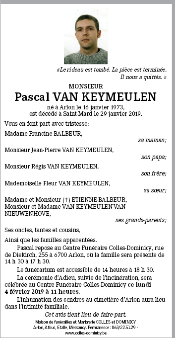 Décédé à Virton (6760) le mardi 29 janvier 2019 à l'âge de 45 ans