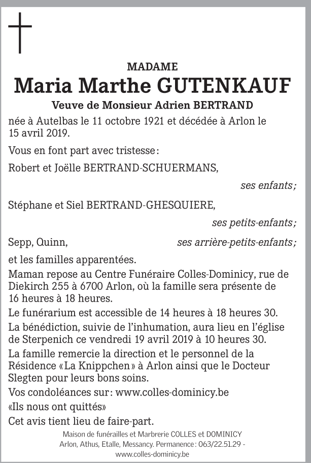 Décédée à Arlon (6700) le lundi 15 avril 2019 à l'âge de 97 ans