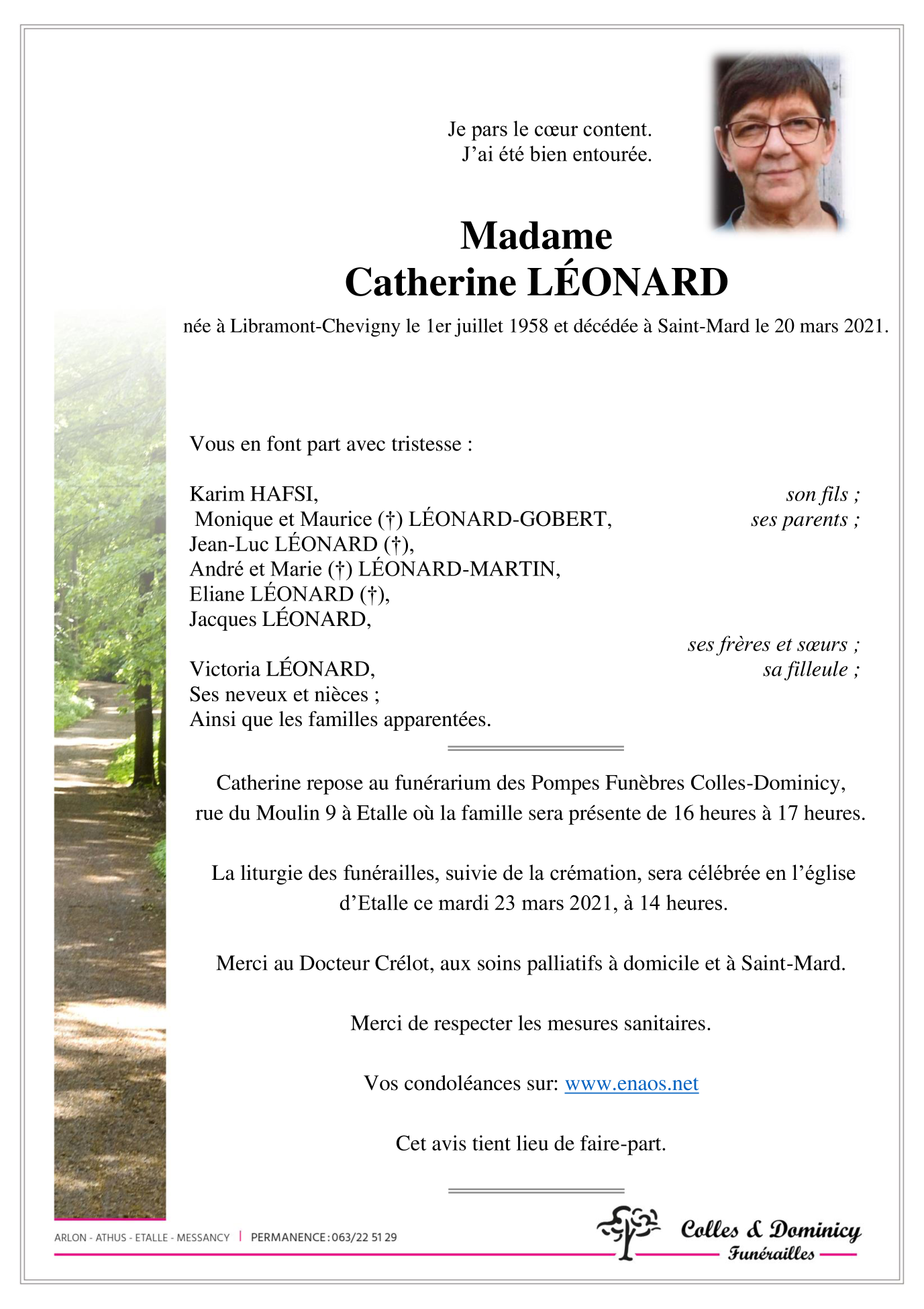 Décédée à Saint-Mard (6762) le samedi 20 mars 2021 à l'âge de 62 ans
