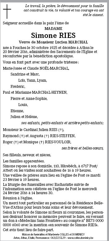 Décédée à Athus (6791) le samedi 20 février 2016 à l'âge de 90 ans