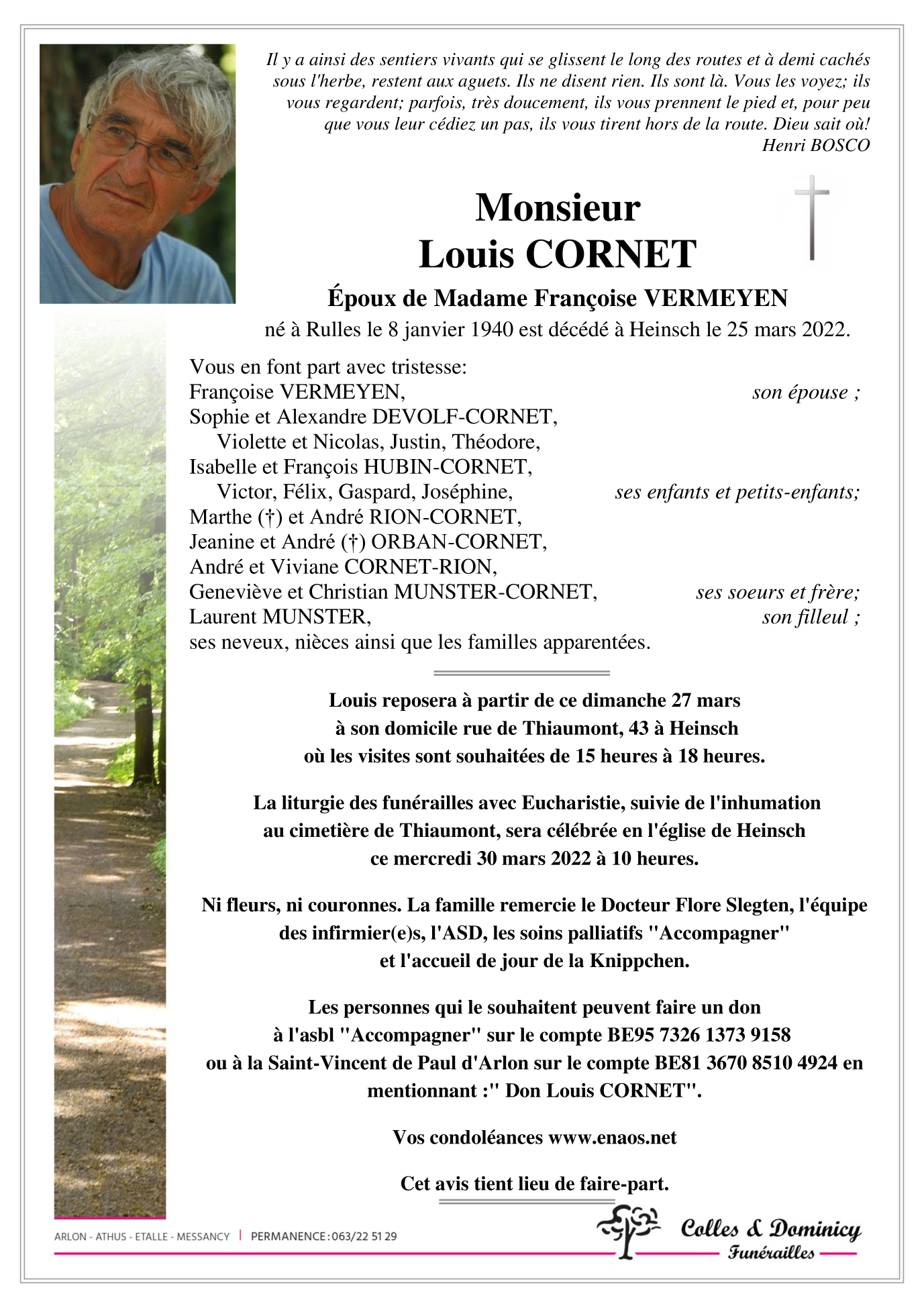 Décédé à Heinsch (6700) le vendredi 25 mars 2022 à l'âge de 82 ans