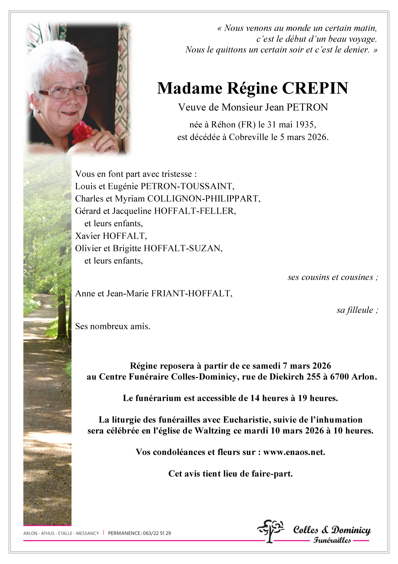 Décédée à Vaux-sur-Sure (6640) le jeudi 5 mars 2026 à l'âge de 90 ans