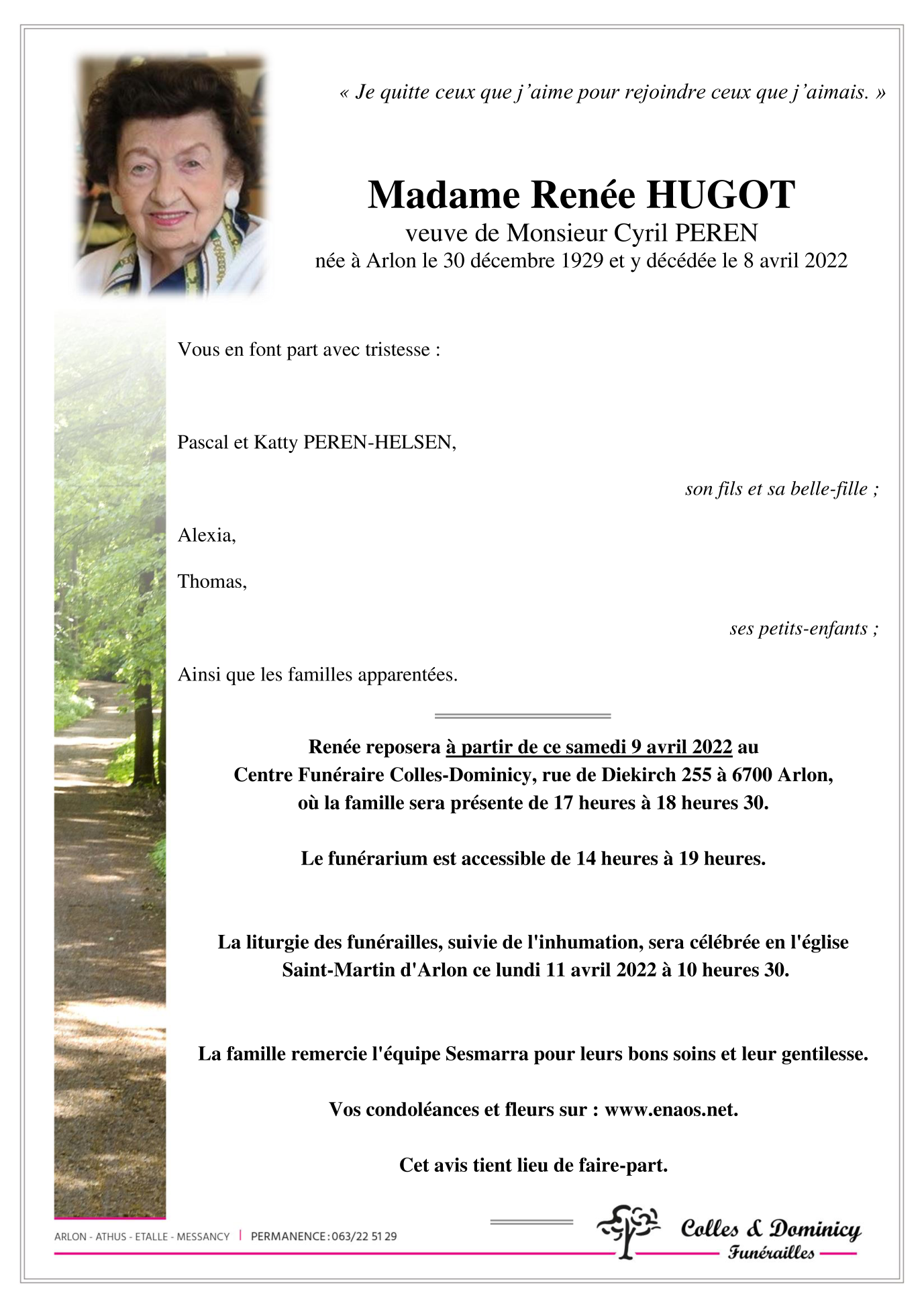 Décédée à Arlon (6700) le vendredi 8 avril 2022 à l'âge de 92 ans