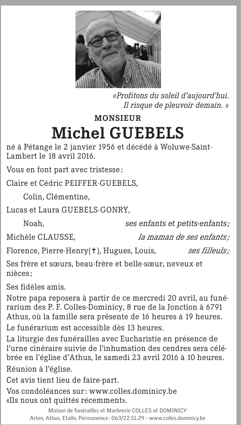 Décédé à Bruxelles (Woluwe-Saint-Lambert) (1200) le lundi 18 avril 2016 à l'âge de 60 ans