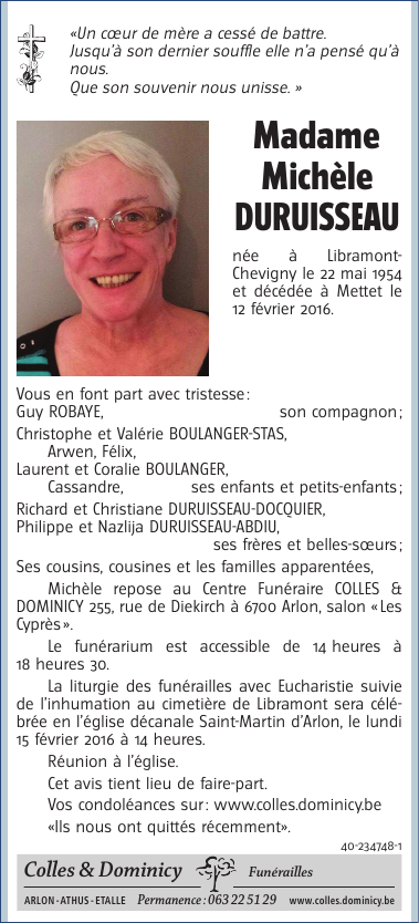 Décédée à Biesme (5640) le vendredi 12 février 2016 à l'âge de 61 ans
