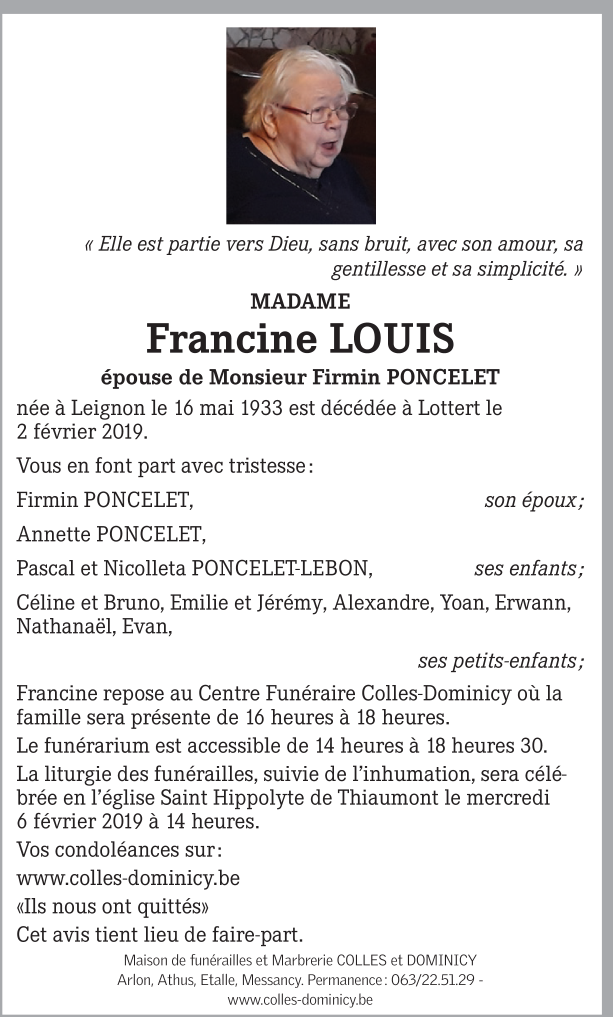 Décédée à Lottert (6717) le samedi 2 février 2019 à l'âge de 85 ans