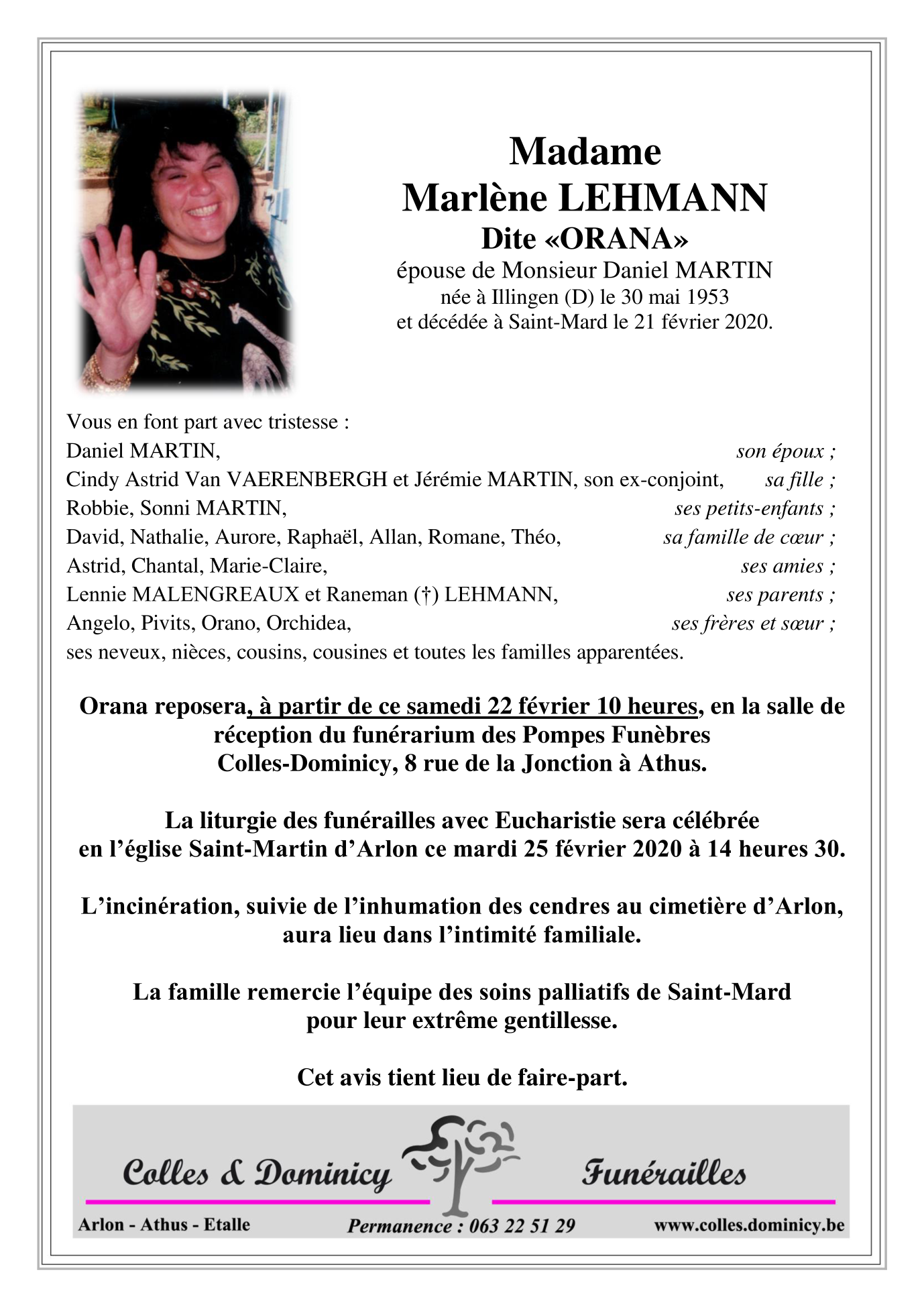 Décédée à Saint-Mard (6762) le vendredi 21 février 2020 à l'âge de 66 ans