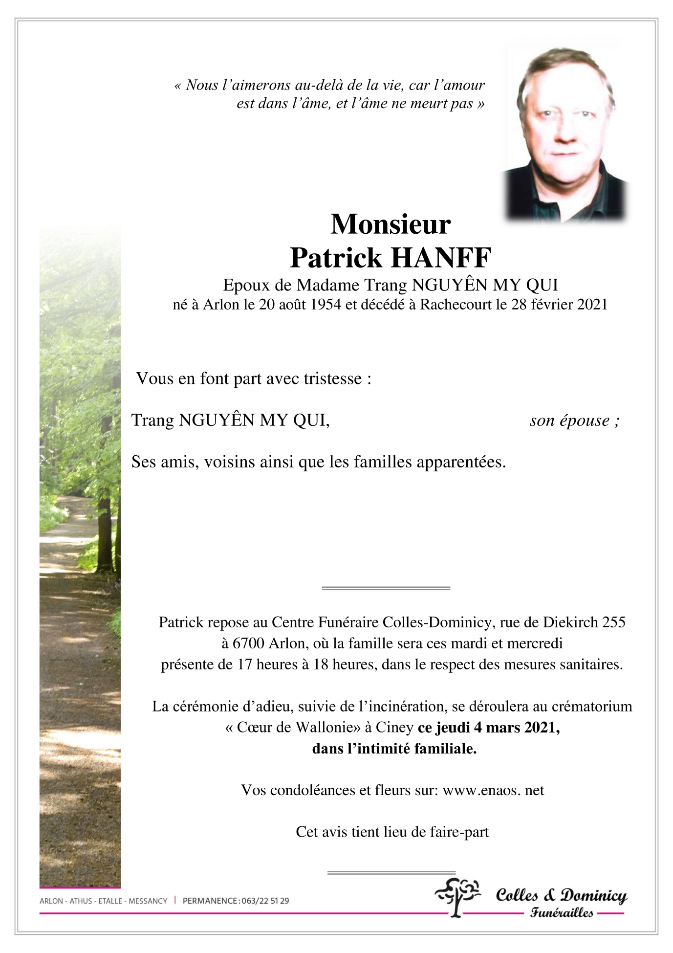 Décédé à Rachecourt (6792) le dimanche 28 février 2021 à l'âge de 66 ans