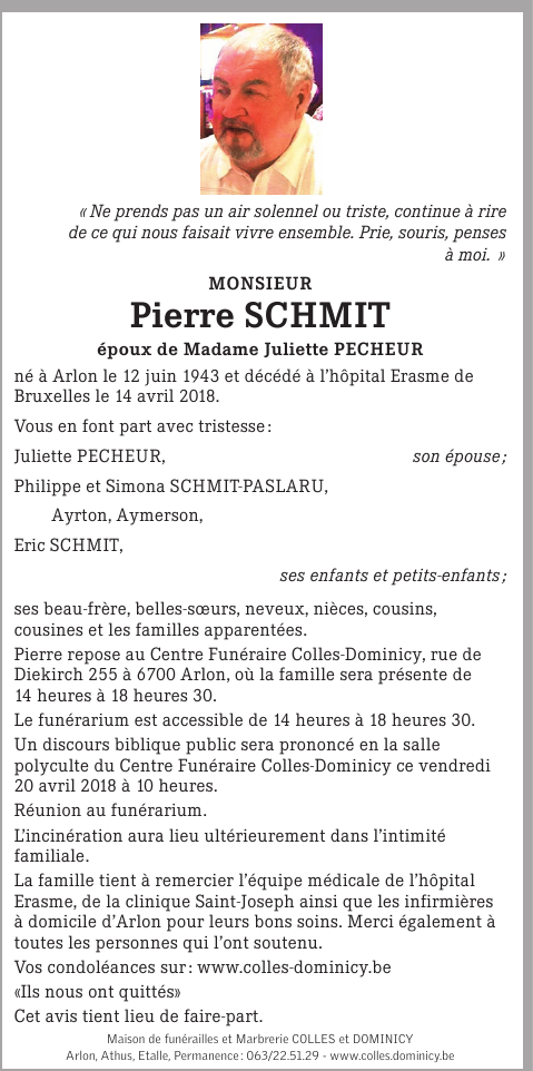 Décédé à Bruxelles (1000) le samedi 14 avril 2018 à l'âge de 74 ans