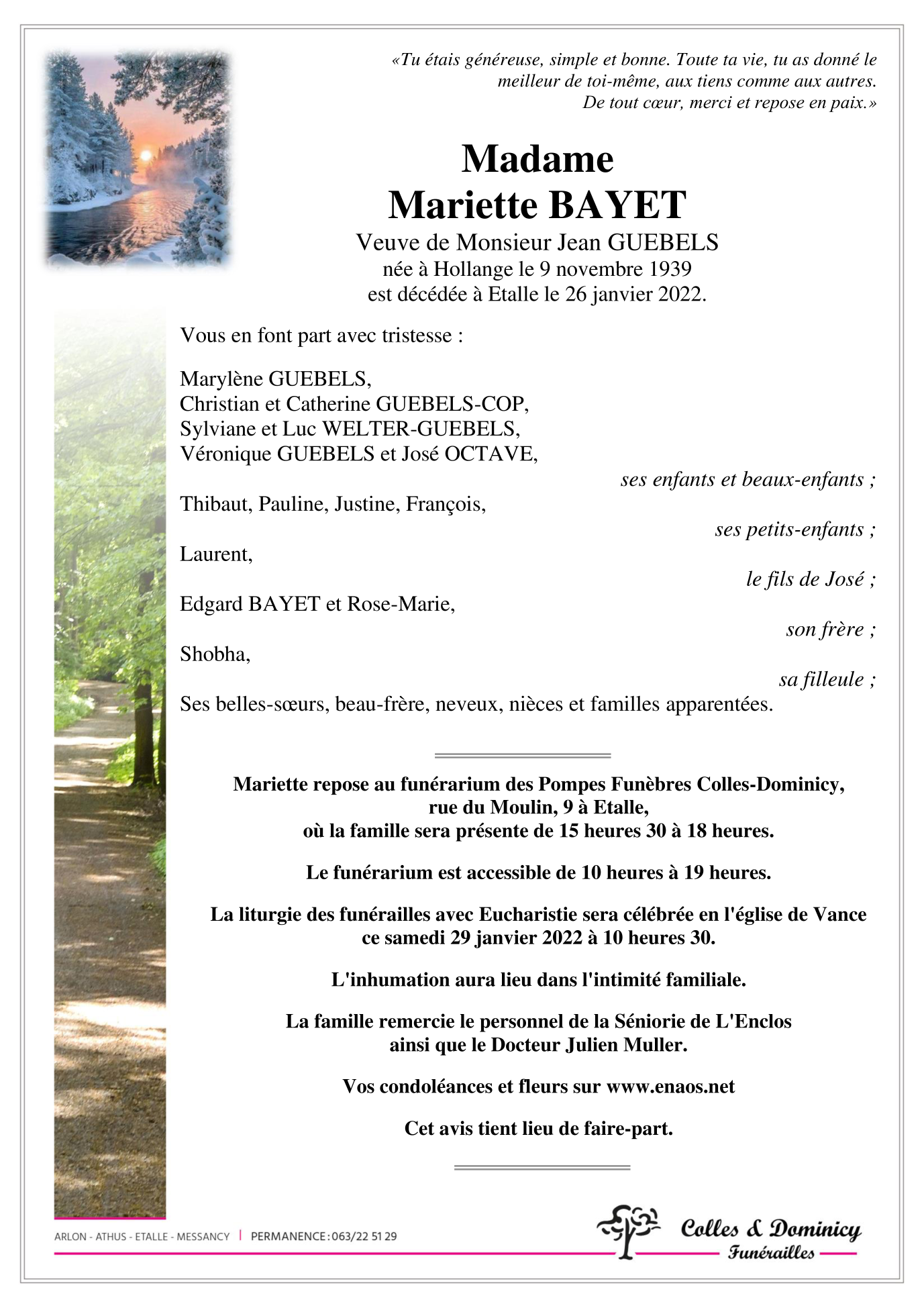 Décédée à Etalle (6740) le mercredi 26 janvier 2022 à l'âge de 82 ans