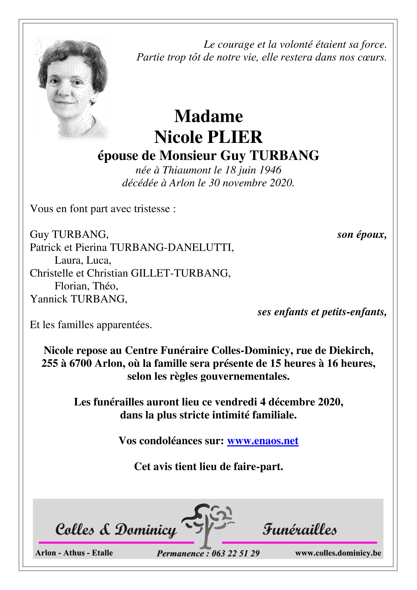 Décédée à Arlon (6700) le lundi 30 novembre 2020 à l'âge de 74 ans