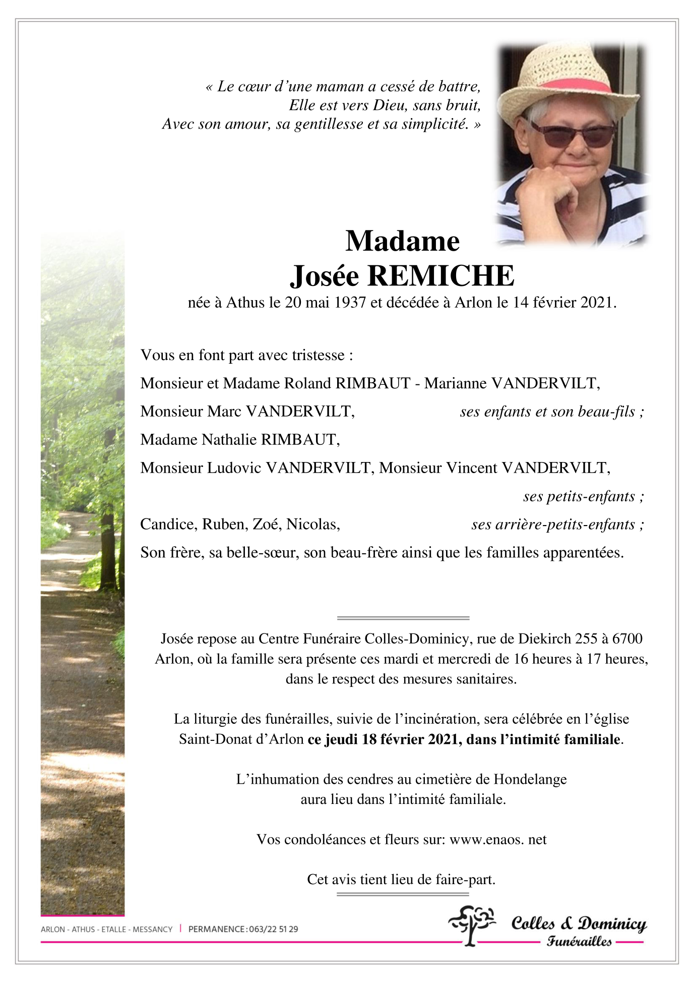 Décédée à Arlon (6700) le dimanche 14 février 2021 à l'âge de 83 ans