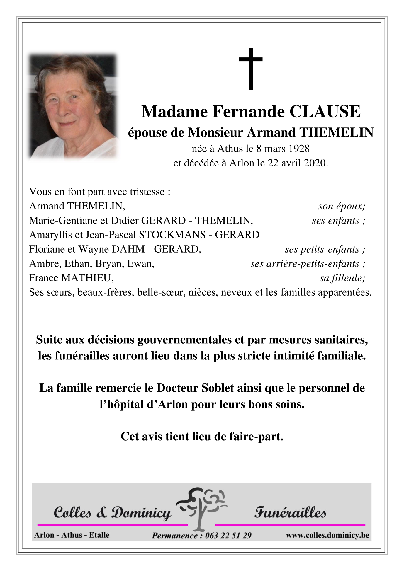 Décédée à Arlon (6700) le mercredi 22 avril 2020 à l'âge de 92 ans