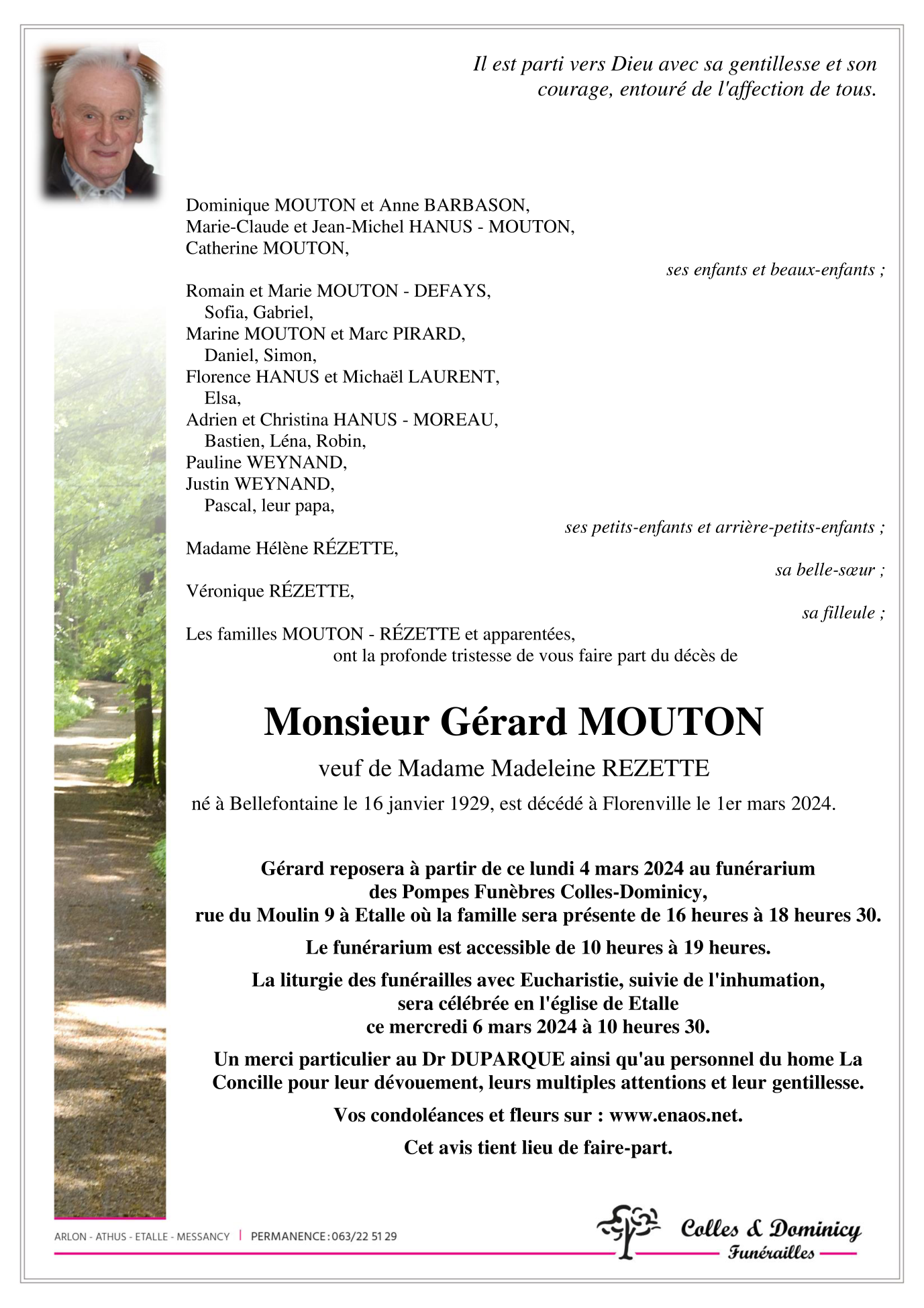 Décédé à Florenville (6820) le vendredi 1 mars 2024 à l'âge de 95 ans