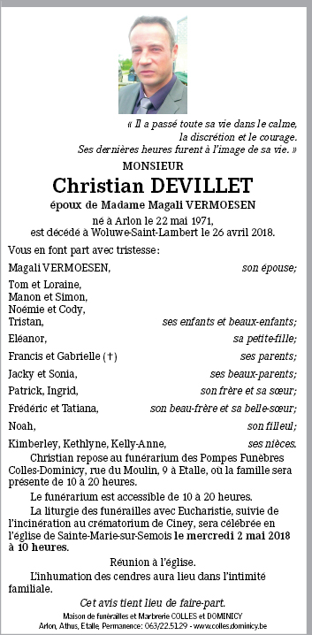 Décédé à Woluwe-Saint-Lambert (1200) le jeudi 26 avril 2018 à l'âge de 46 ans