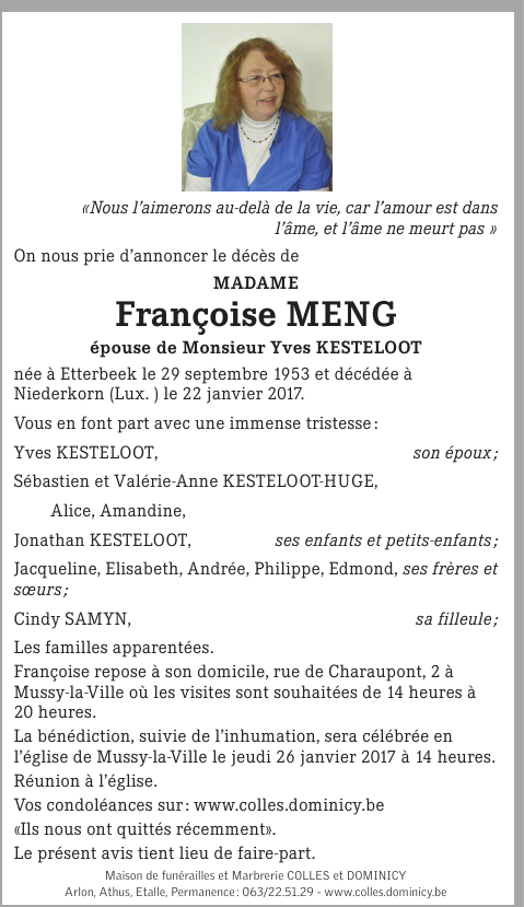 Décédée à Niederkorn (4602, Luxembourg) le dimanche 22 janvier 2017 à l'âge de 63 ans