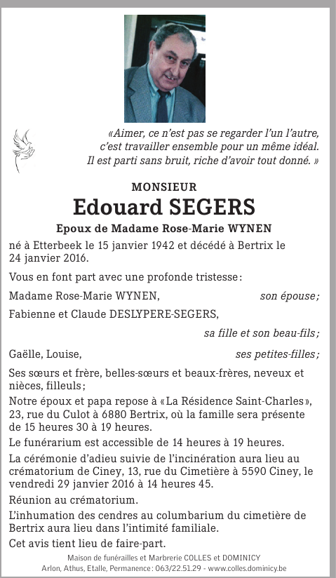 Décédé à Bertrix (6880) le dimanche 24 janvier 2016 à l'âge de 74 ans