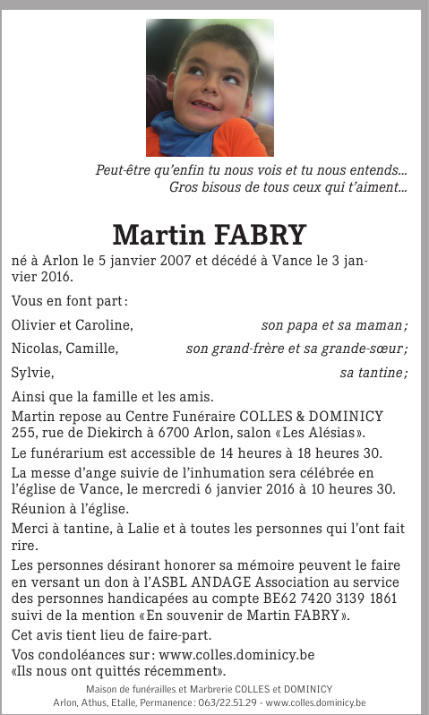Décédé à Vance (6741) le dimanche 3 janvier 2016 à l'âge de 8 ans