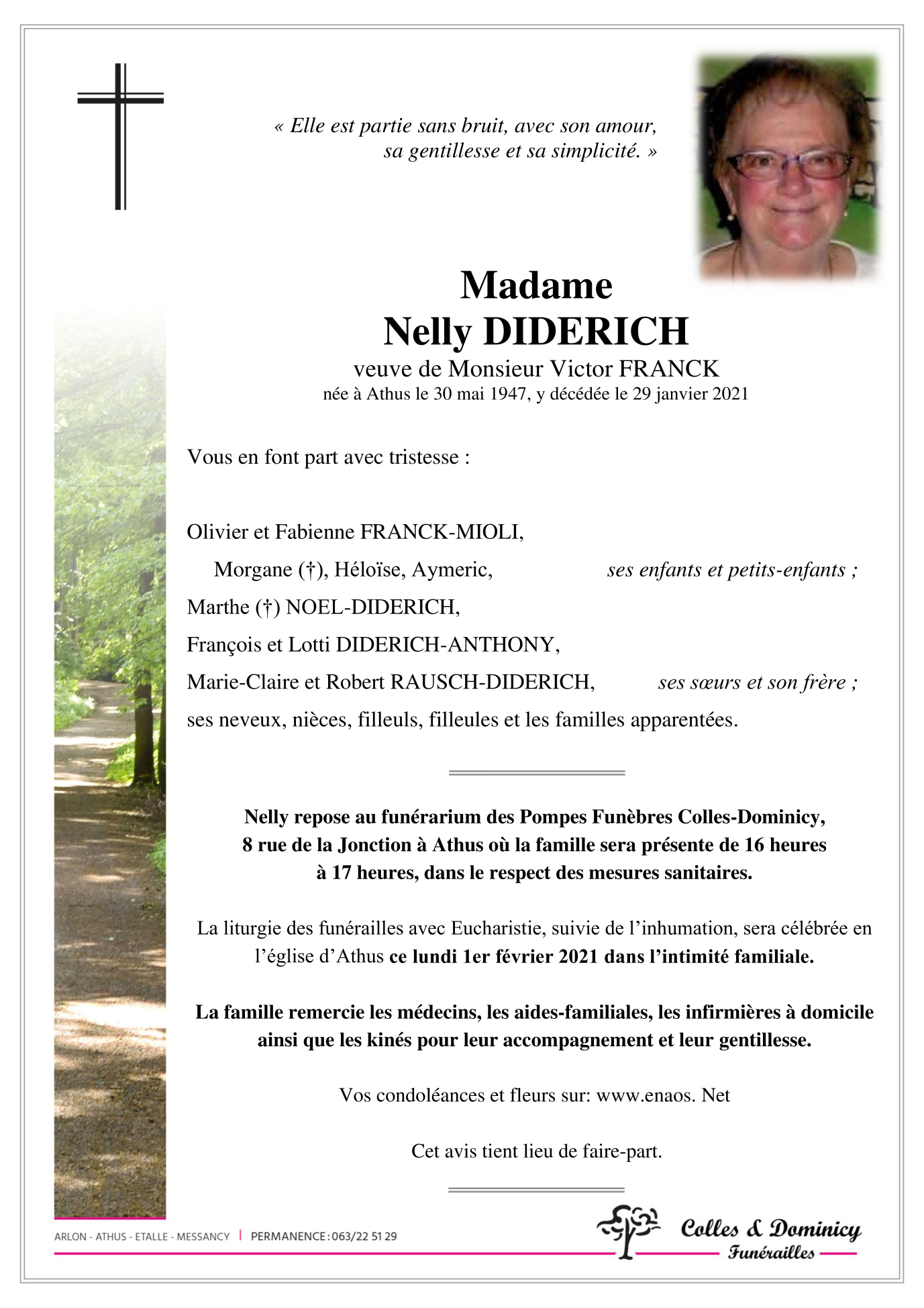 Décédée à Athus (6791) le vendredi 29 janvier 2021 à l'âge de 73 ans