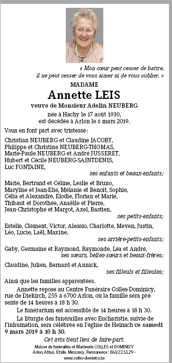 Décédée à Arlon (6700) le mercredi 6 mars 2019 à l'âge de 88 ans