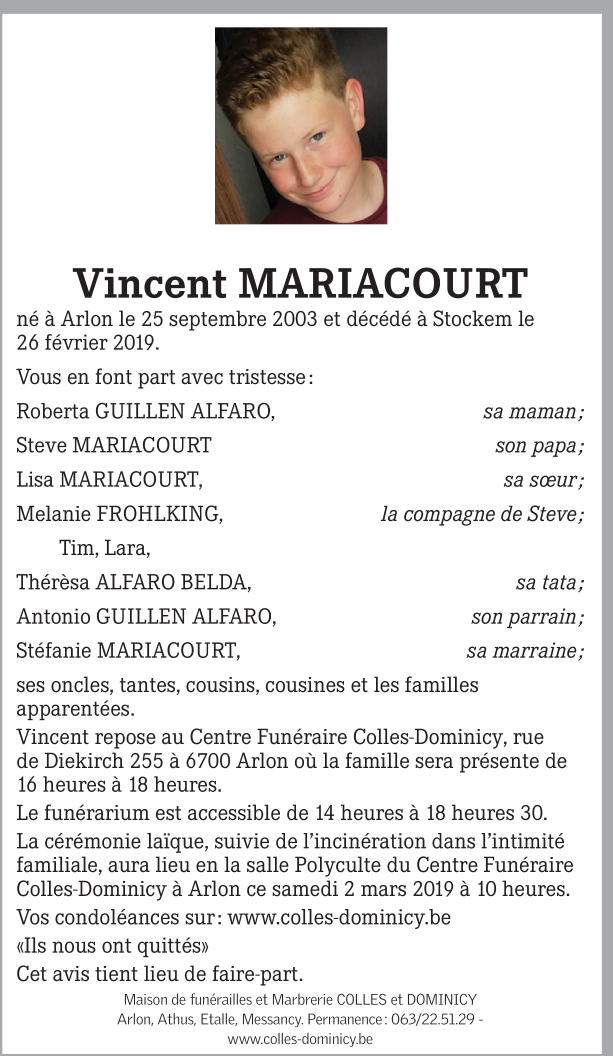 Décédé à Stockem (6700) le mardi 26 février 2019 à l'âge de 15 ans